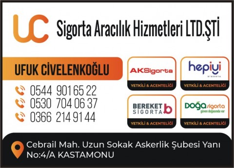 ÇETİN ÖZBEK SİGORTA AR. HİZM. LTD. ŞTİ Tel: 212 40 43 Gsm: 0505 345 74 44 – 0505 345 74 45 Hepkebirler Mahallesi Nasrullah İş Merkezi Giriş Katı No:11 KASTAMONU |
