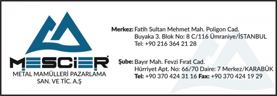 MESCİER METAL MAÜLLERİ PAZARLAMA SAN. ve TİC. A.Ş. Merkez Tel: 424 31 16 Faks: 424 19 29 Bayır Mahalle Fevzi Fırat Caddesi Hürriyet Apt. No:66/70 Daire : 7 KARABÜK |